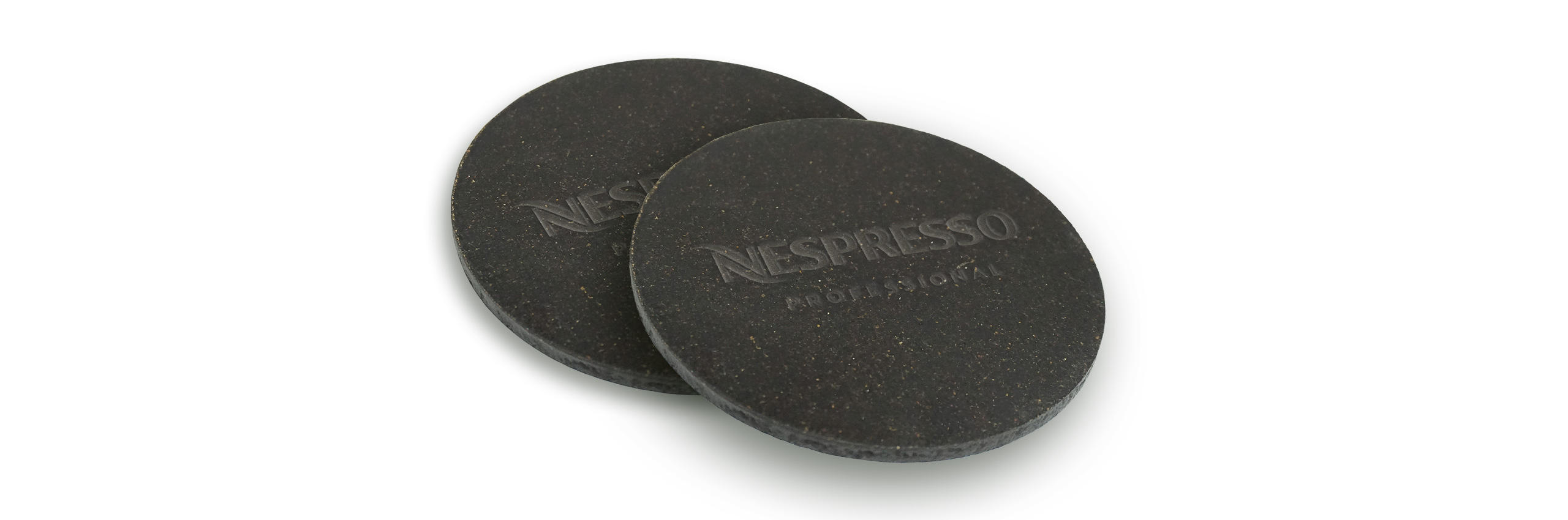 Made from 30% recycled Nespresso coffee. Set of two coasters.